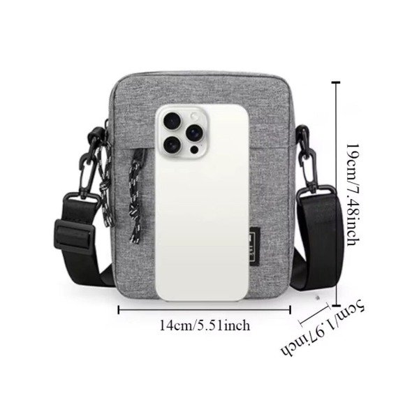 Medidas: 19 cm. alto x 14 cm. ancho x 5 cm. profundidad Colores: Negro, gris y azul Tela: Oxford